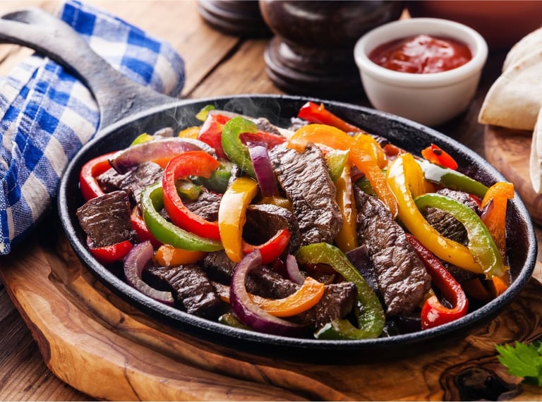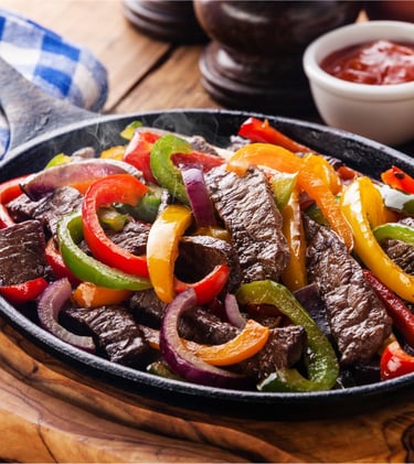 Tender sliced, grilled beef or chicken with tomatoes, onions and bell peppers, served with beans, rice, cheese, guacamole salad and sour cream