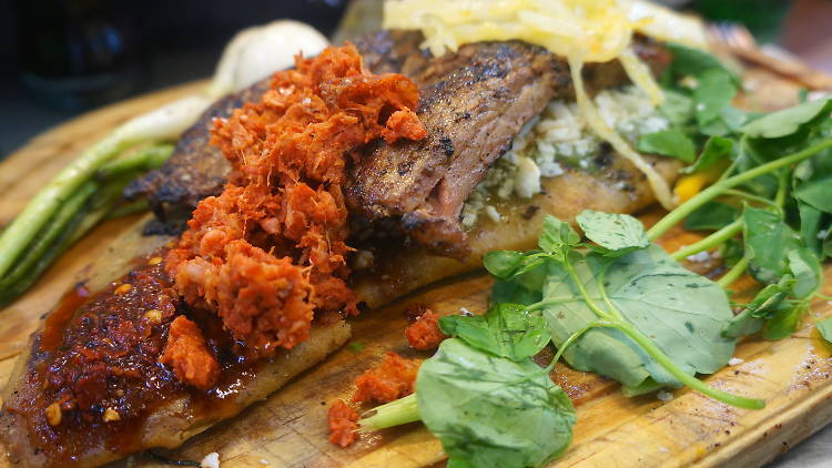 Rib-eye, mexican sausage chicken marinade, nopal, guacamole, chile toreado, cebollitas and tortillas